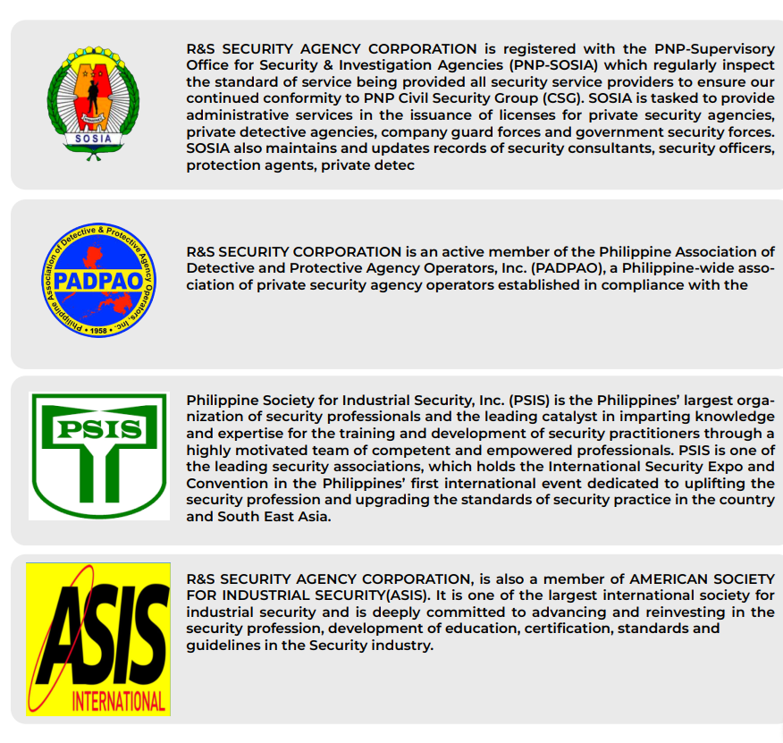 R&S Security Agency Corporation (RSSAC) provides well-trained security personnel across the Philippines. Established in 2021, it aims to build lasting client relationships, expand regionally, and deliver tailored security solutions through careful recruitment, training, and evaluation to meet each client’s unique needs.